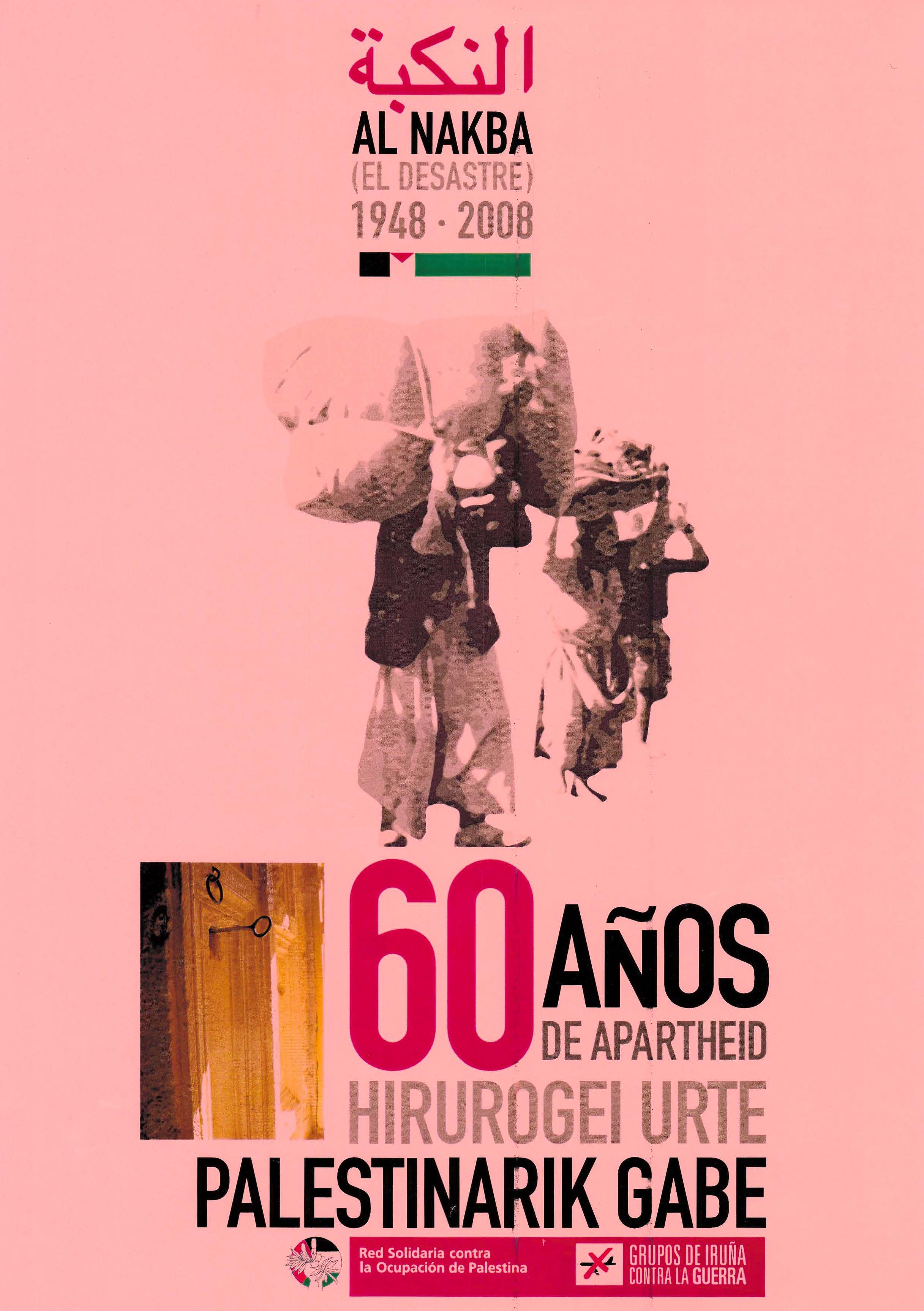 Cartel que recuerda el 60 aniversario del Nakba, la expulsión masiva de palestinos en 1948, durante la creación del Estado de Israel. Se conmemora cada año el 15 de mayo. El cartel muestra una imagen de una familia de palestinos huyendo y una fotografía con una puerta y una llave, el símbolo de su derecho a volver. El cartel va firmado por la Red Solidaria contra la Ocupación de Palestina y los Grupos de Iruña contra las guerras.