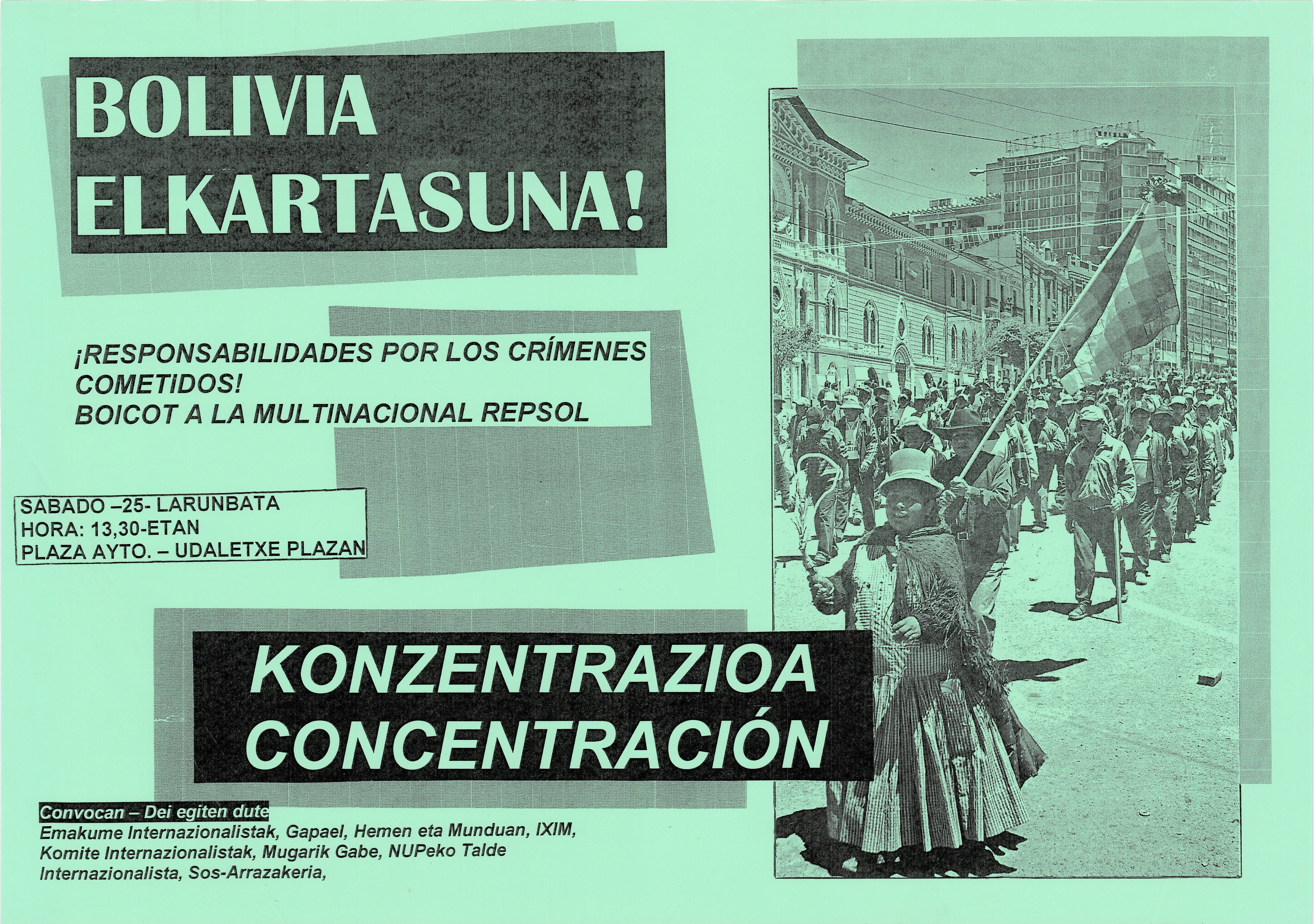 Cartel que anuncia una concentración en la plaza del Ayuntamiento de Pamplona en defensa de Bolivia y en repulsa de los crímenes de las multinacionales. El cartel muestra una fotografía de una mujer indígena con una masa que le sigue y el siguiente texto: ¡Responsabilidades por los crímenes cometidos! Boicot a la multinacional Repsol. La protesta es el sábado 25, a las 13:30, y convocan Emakume Internazionalistak, Gapael, Hemen eta Munduan, IXIM, Komite Internazionalistak, Mugarik Gabe, NUPeko Talde Internazionalista y SOS-Arrazakeria.