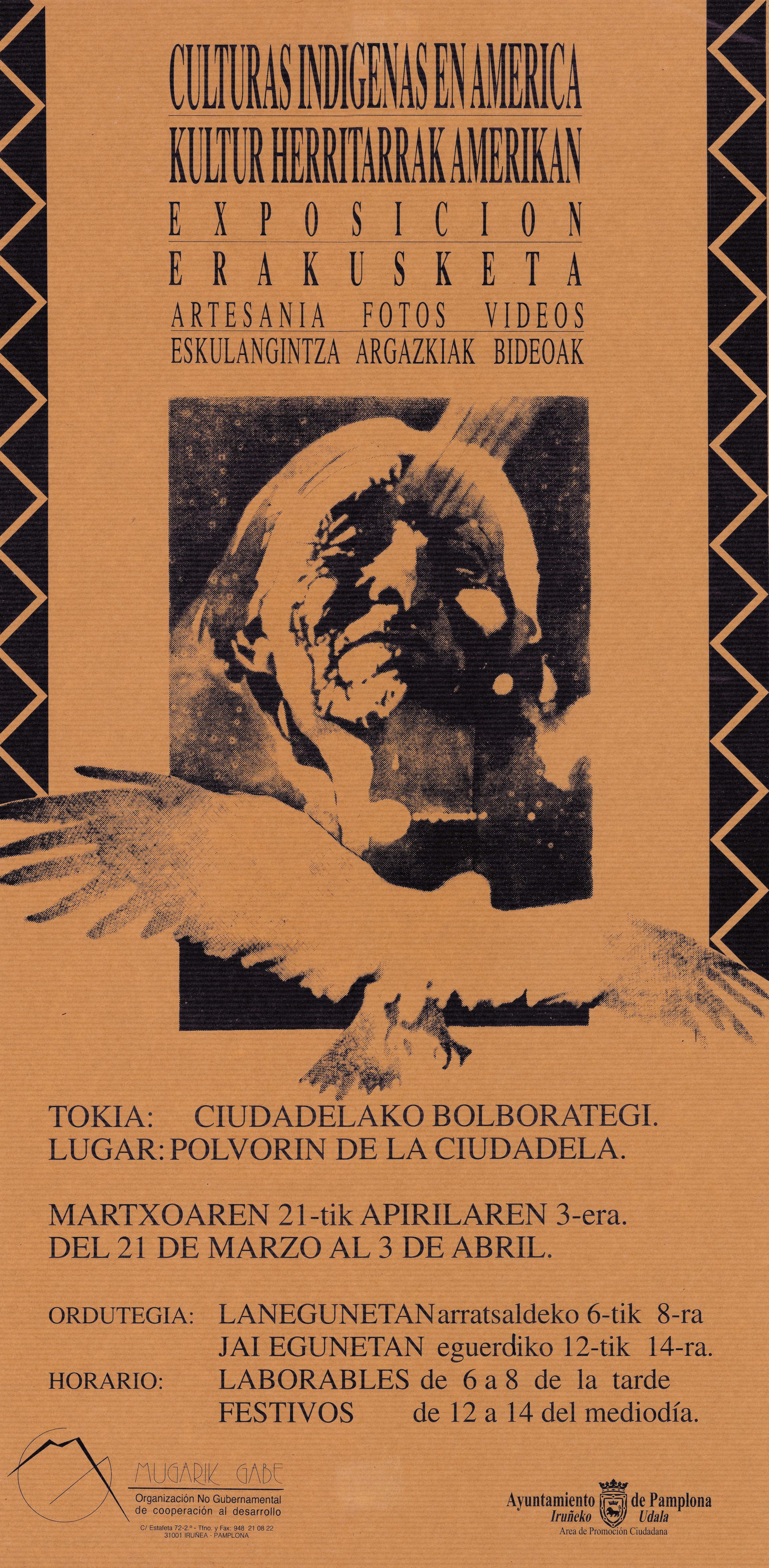 Cartel que anuncia una exposición de artesanía, fotografías y vídeos sobre las Culturas Indígenas de América. El cartel muestra una ilustración de una señora mayor y una paloma blanca. La exposición se puede ver en el Polvorín de la Ciudadela, en Pamplona, y se puede ver del 21 de marzo al 3 de abril.