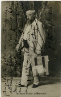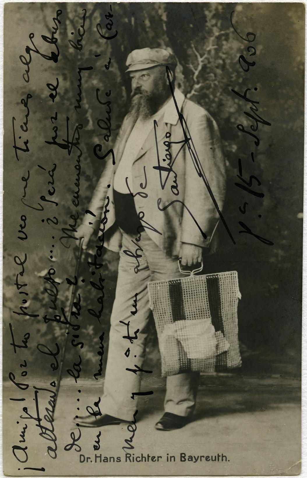 Retrato de esudio en plano entero del director de orquesta Hans Richter con paisaje pintado de fondo. En la parte inferior, texto impreso: "Dr. Hans Ritches in Bayreuth" y texto manuscrito de correspondencia privada fechado el 15 de septiembre de 1906 de Santiago Vengoechea a Santos Laspiur