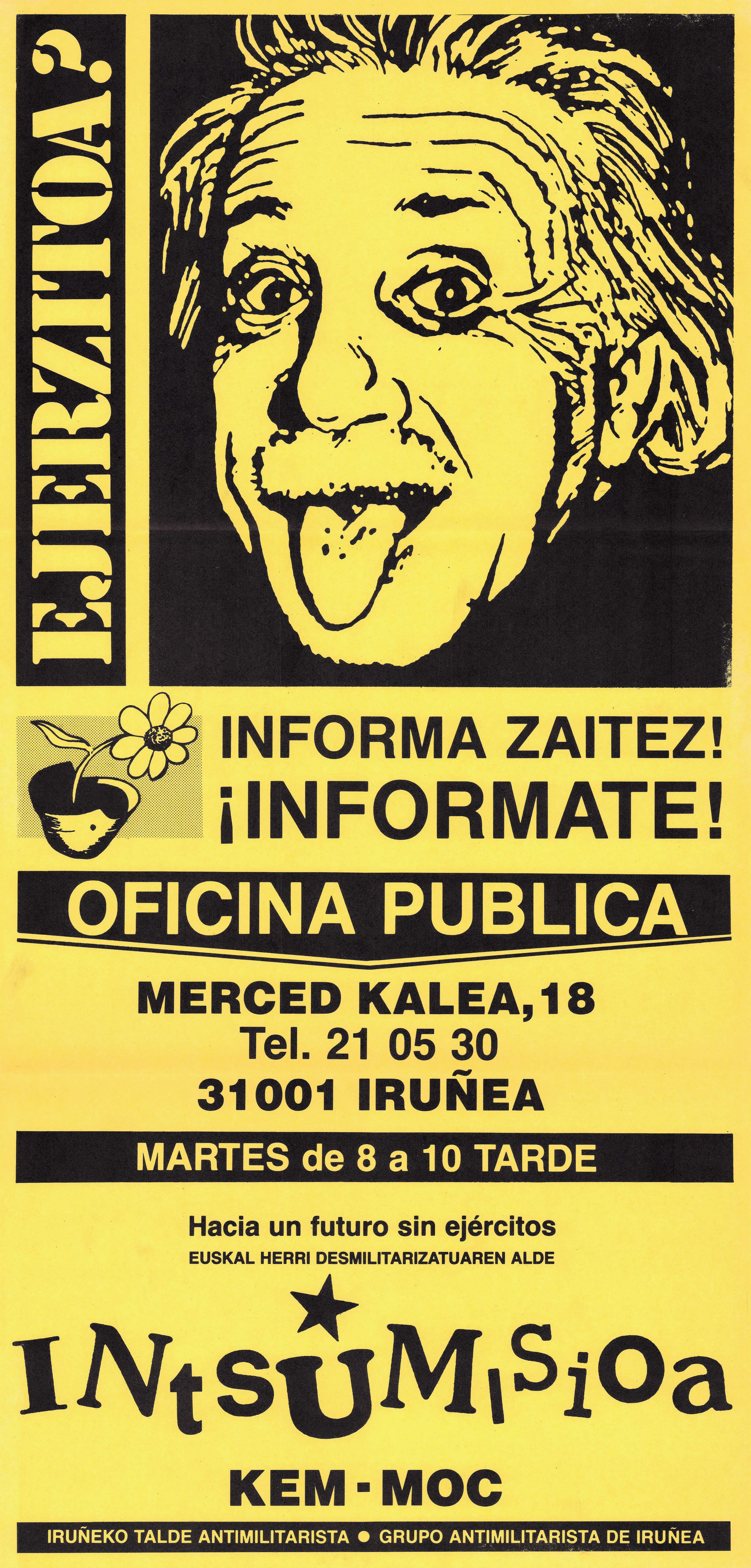 Dentro de la campaña antimilitarista a favor de la insumisión ?Hacia un futuro sin ejércitos?, se publicita la existencia de una oficina pública en la calle de la Merced (Pamplona) ofreciendo información sobre el tema.