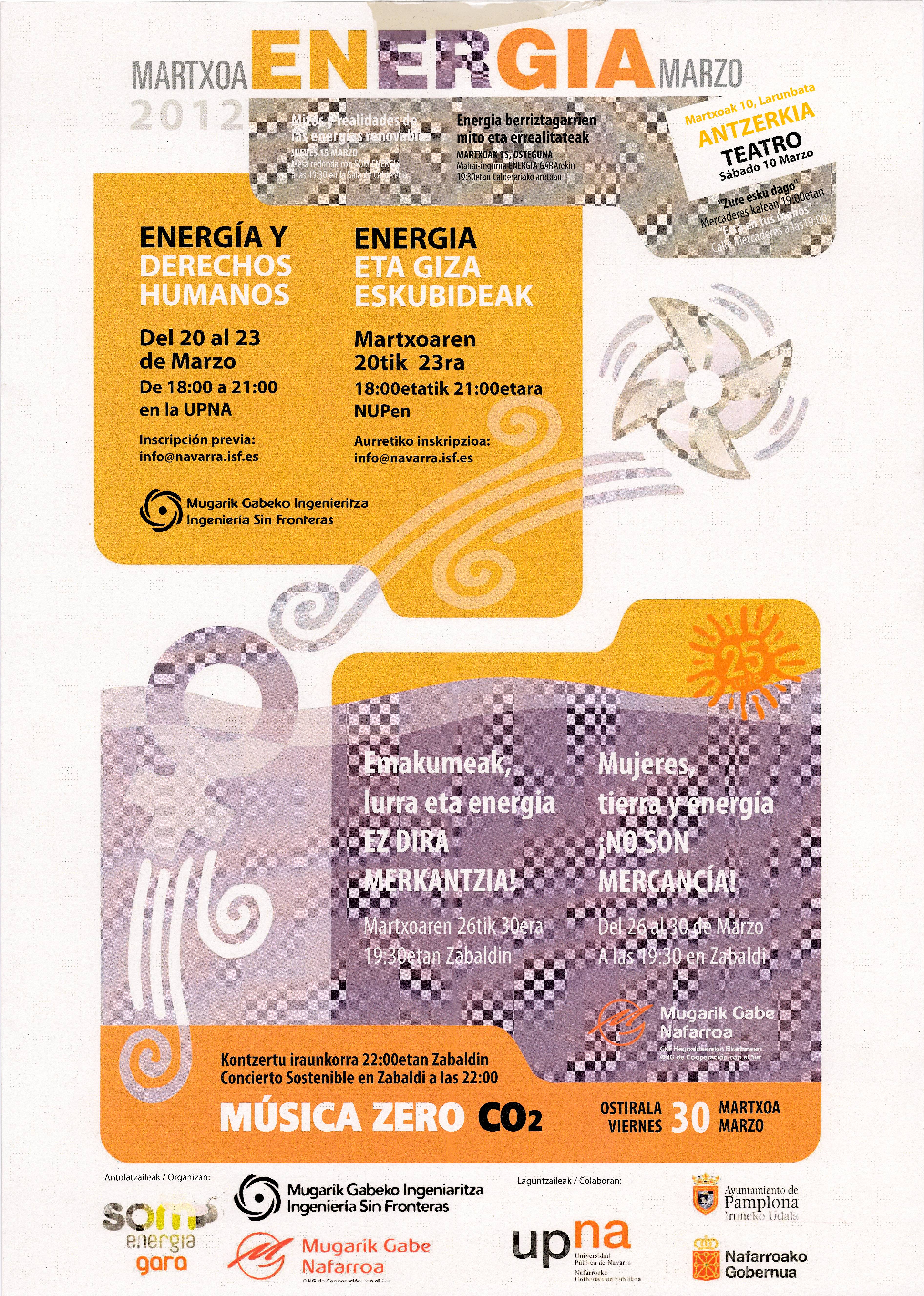 Cartel que anuncia las jornadas sobre energía que se celebran del 20 al 23 de marzo de 2012 en la UPNA. El cartel muestra una serie de actividades: unas charlas sobre energía y Derechos Humanos en la UPNA del 20 al 23 de marzo; otras jornadas tituladas "Mujeres, tierra y energía ¡No son mercancía!", en Zabaldi; el 15 de marzo una mesa redonda en la Sala Calderería titlada "Mitos y realidades de las energías renovables"; y el 10 de marzola obra de teatro "Está en tus manos" en Mercaderes; y el 30 de marzo concierto sostenible en Zabaldi, con Música Zero CO2.