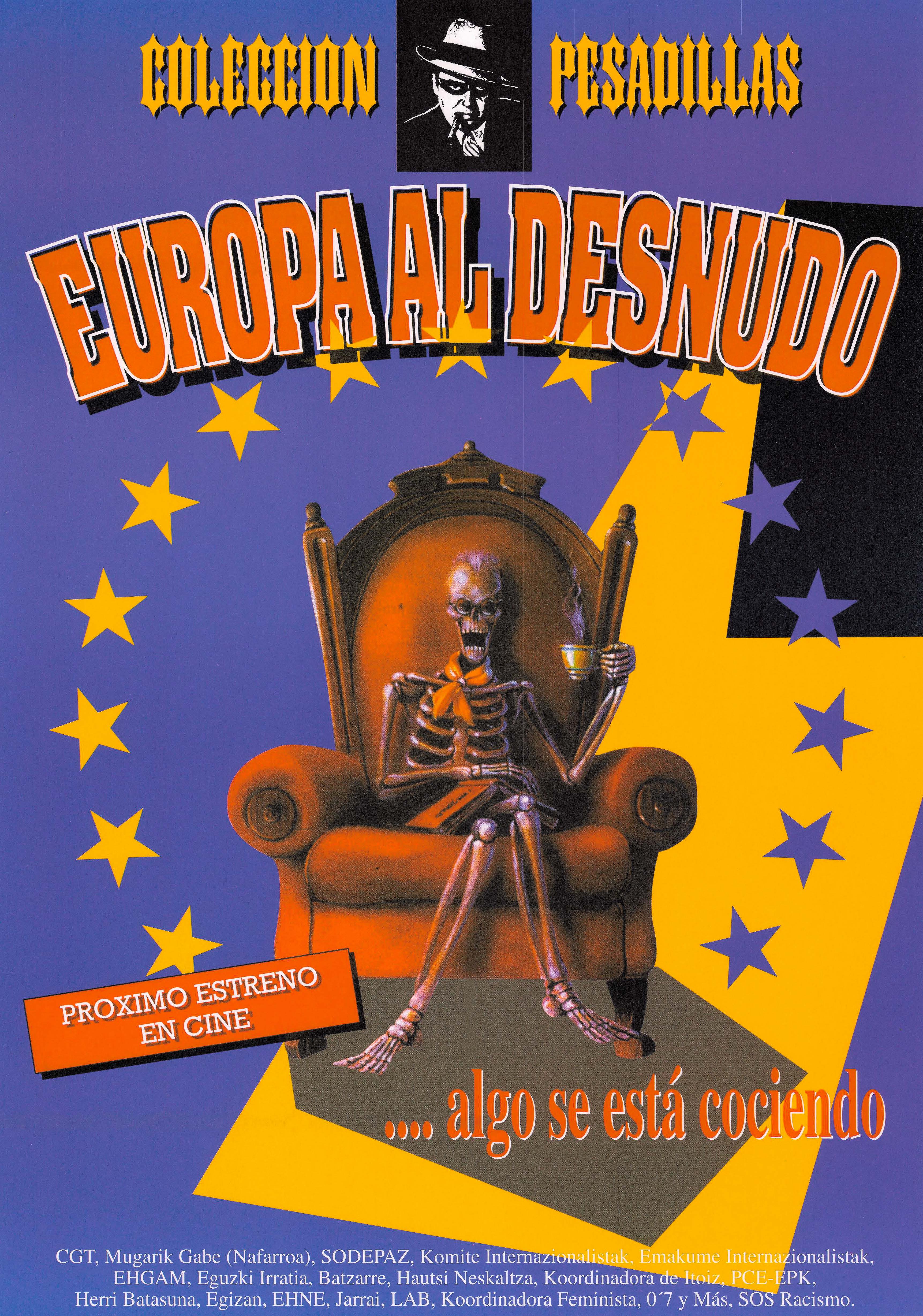 Cartel satírico sobre las políticas europeas que muestra un esqueleto en un sofá de lujo tomando el té y riendo. Los colores del cartel son los de la Unión Europea. El cartel va firmado por varios colectivos: CGT, Mugarik Gabe Nafarroa, Sodepaz, Komite Internazionalistak, Emakume Internazionalistak, EHGAM, Eguzki Irratia, Batzarre, Hautsi Neskaltza, Coordinadora de Itoiz, PCE-EKP, Herri Batasuna, Egizan, EHNE, Jarrai, LAB, Koordinadora feminista, 0,7 y Más, Sos Racismo. El cartel es dela década de los 90.