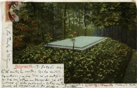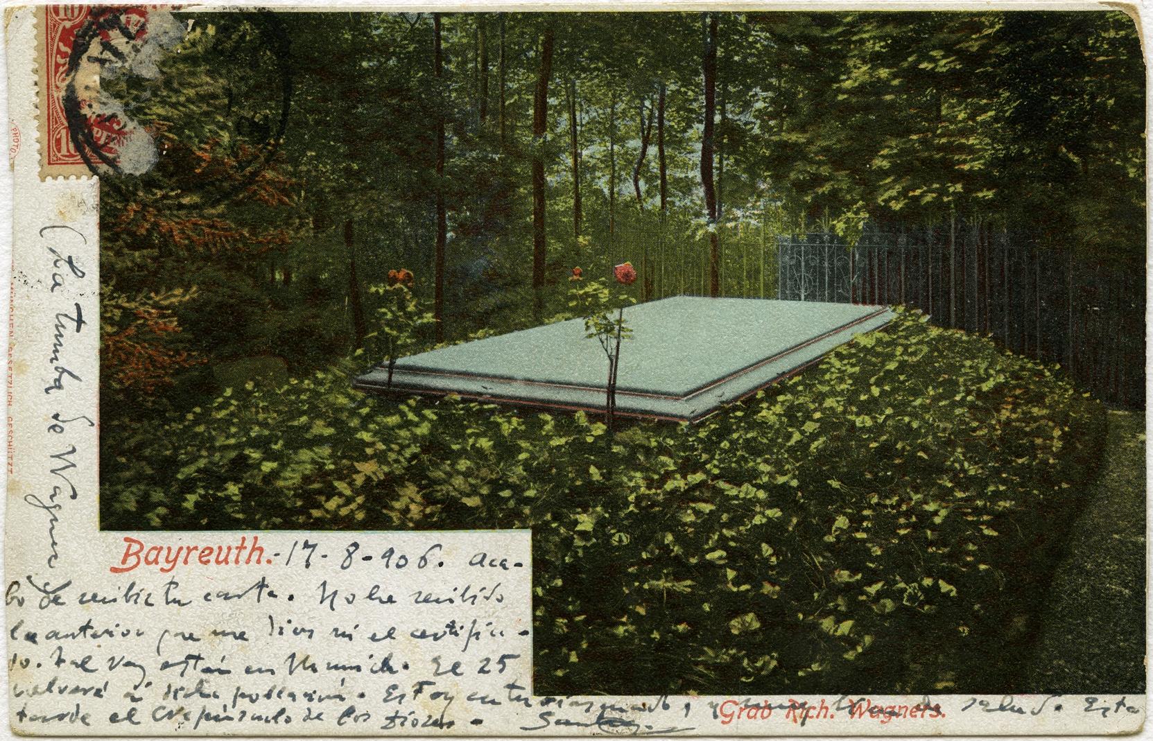 Vista de la tumba de Wagner en la localidad alemana de Bayreuth. Texto impreso: Bayreuth Grab Rtch. Wagner, y texto manuscrito de correspondencia privada con fecha de 17 de agosto de 1906 de Santiago Vengoechea a Santo Laspiur.