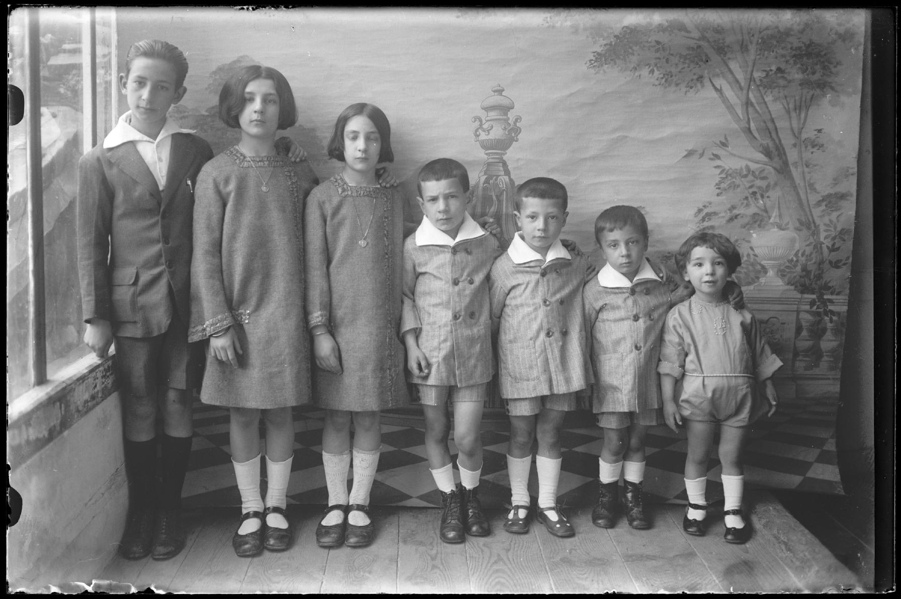 Retrato en plano entero de 7 hijos de José Martínez Berasáin y Ramona Erro Cía, en una galería con un fondo pintado con una fuente en una terraza y paisaje, al fondo. De izquierda a derecha, Luis, Margarita, Mercedes, José Ramón, Javier, Alejandro y Juan Bautista.