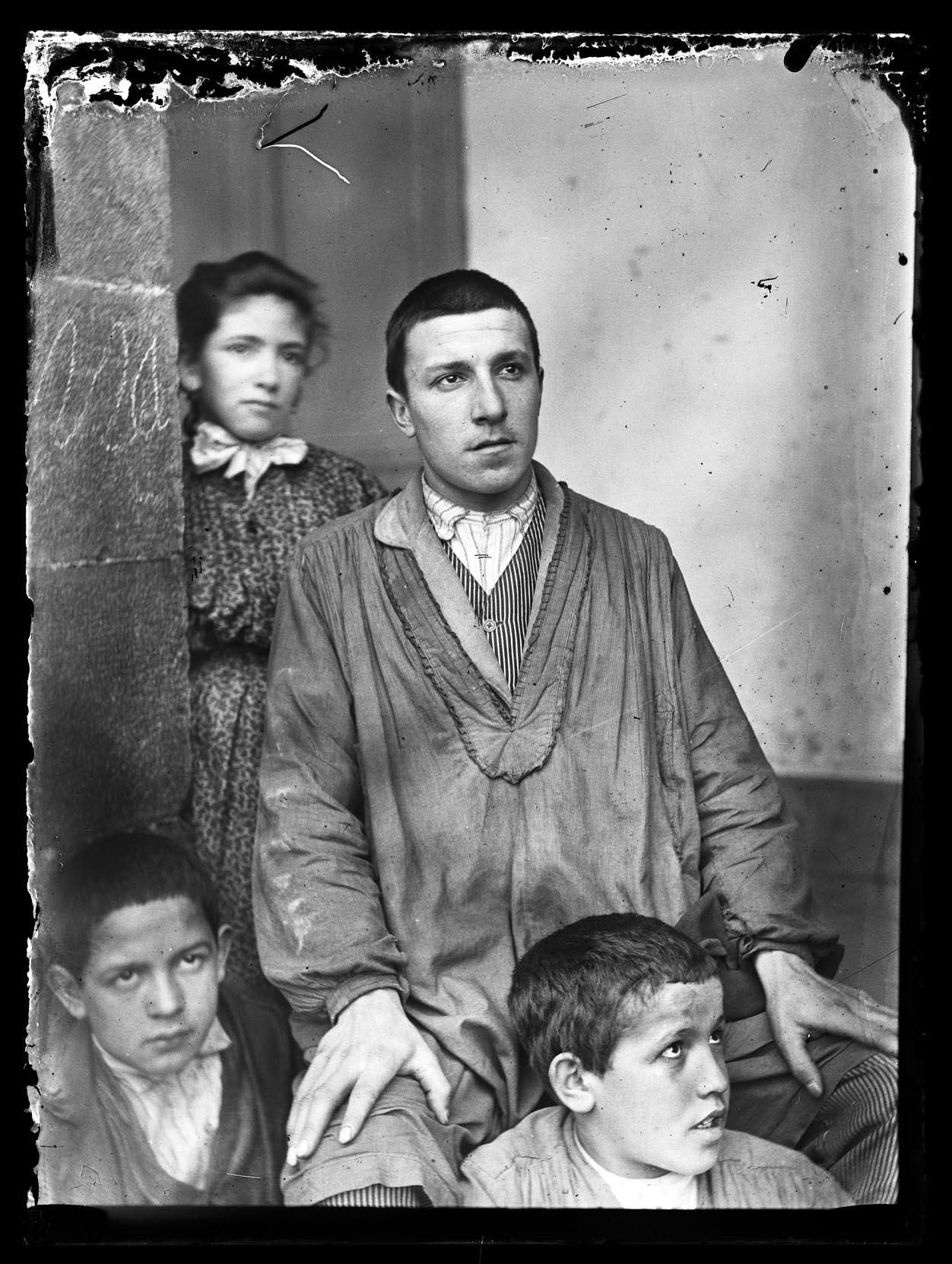 • Contenido: Retrato en plano americano de un hombre joven sentado junto a 2 niños y una niña en pie, detrás.