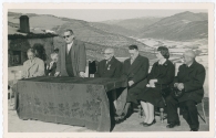 Vista de la mesa presidencial del homenaje del ayuntamiento de Navascués al maestro Jesús Lacasia Redín celebrado en la localidad de Aspuz. De pie, el diputado foral Amadeo Marco hablando al público.