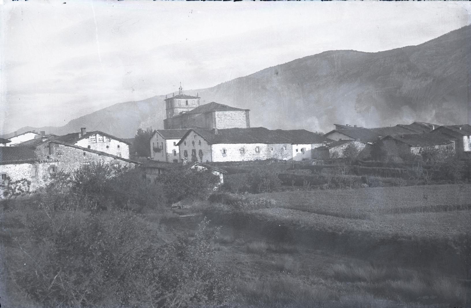 Vista general de la localidad de Huarte Arakil tomada desde el este. En primer termino huertas, en segundo plano las casa de la calle San Juan y detrás la iglesia de San Juan Bautista. Al fondo la sierra de Aralar.