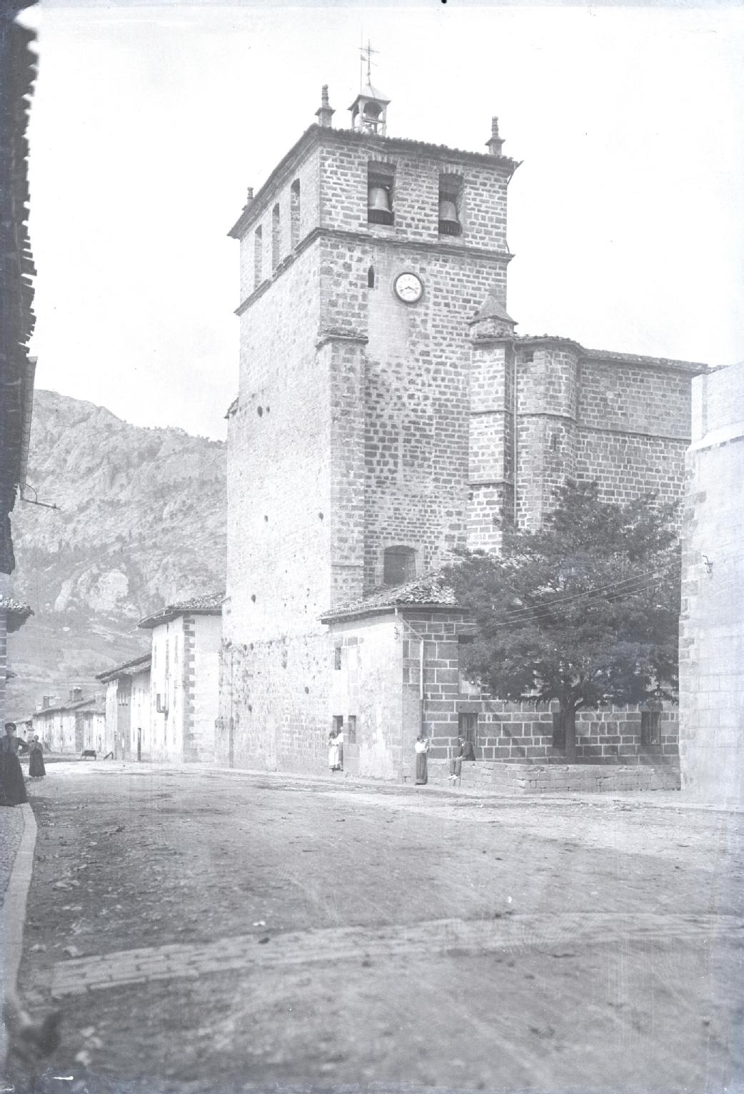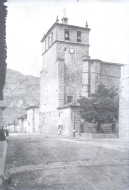 Vista de la torre de la iglesia de San Juan Bautista de Huarte Araquil, tomada desde el sur en la calle del Río. En segundo plano las casa de ésta calle y al fondo los montes del paraje de Makurketa en la sierra de Aralar.
