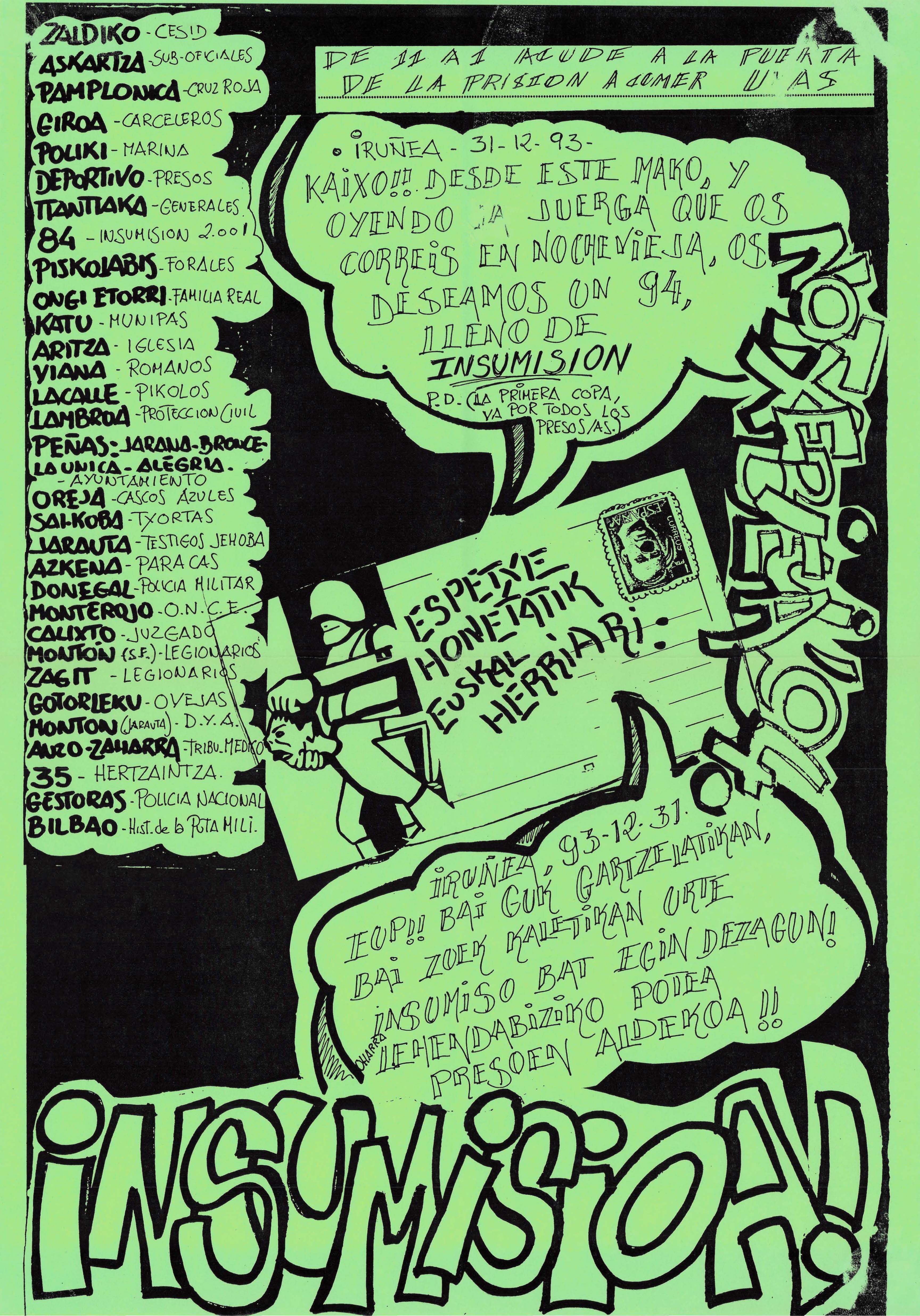 • Contenido: Convocatoria para acudir la noche de Nochevieja (31-12-1993) a las puertas de la cárcel de Pamplona, de 11 de la noche a 1 de la madrugada, para comer allí las uvas, en apoyo a los insumisos allí encerrados.