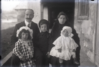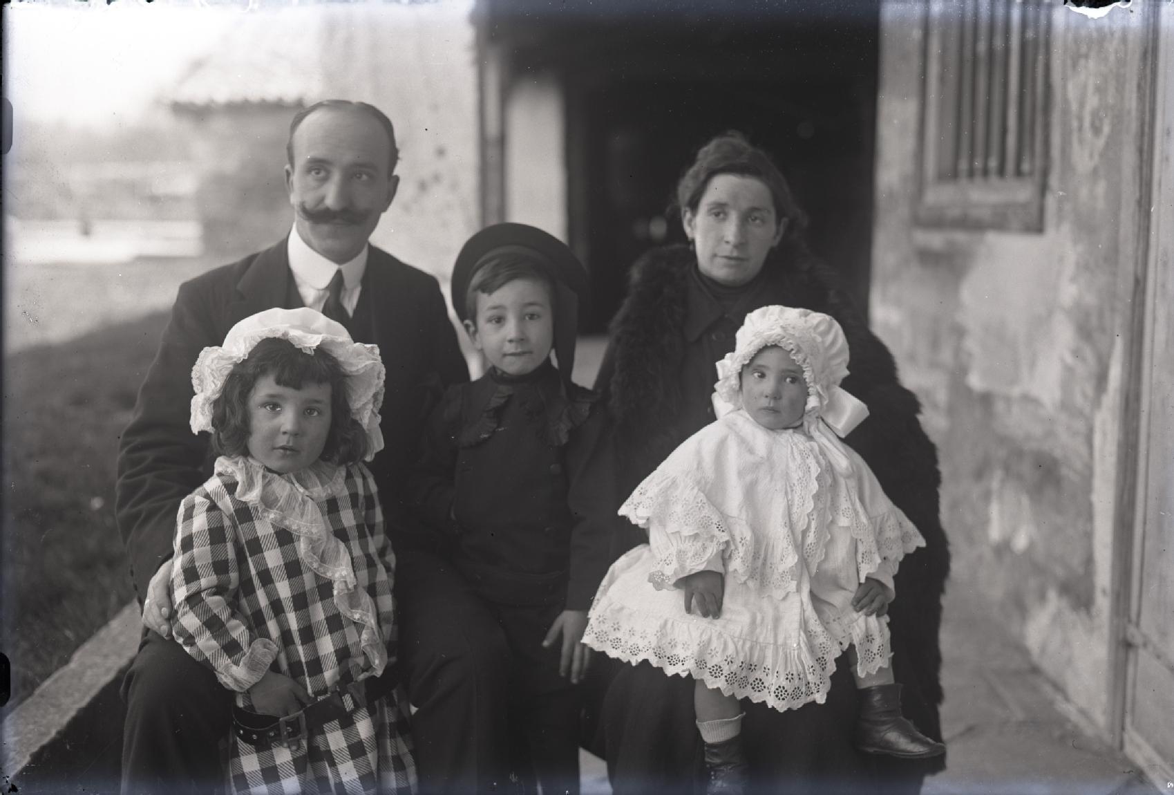 Retrato en plano americano de la familia Martínez Erro. En primer término Luis, Margarita y Mercedes, detrás sus padres, José Martínez Berasáin y Ramona Erro, al fondo un porche con huerto.