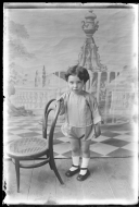Retrato en plano entero de Juan Bautista Martínez Erro, hijo de José Martínez Berasáin y Ramona Erro Cía, de pie junto a una silla y con un fondo pintado con una fuente en una terraza y montes, al fondo.