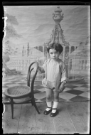 Retrato en plano entero de Juan Bautista Martínez Erro, hijo de José Martínez Berasáin y Ramona Erro Cía, de pie junto a una silla y con un fondo pintado con una fuente en una terraza y montes, al fondo.