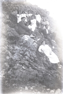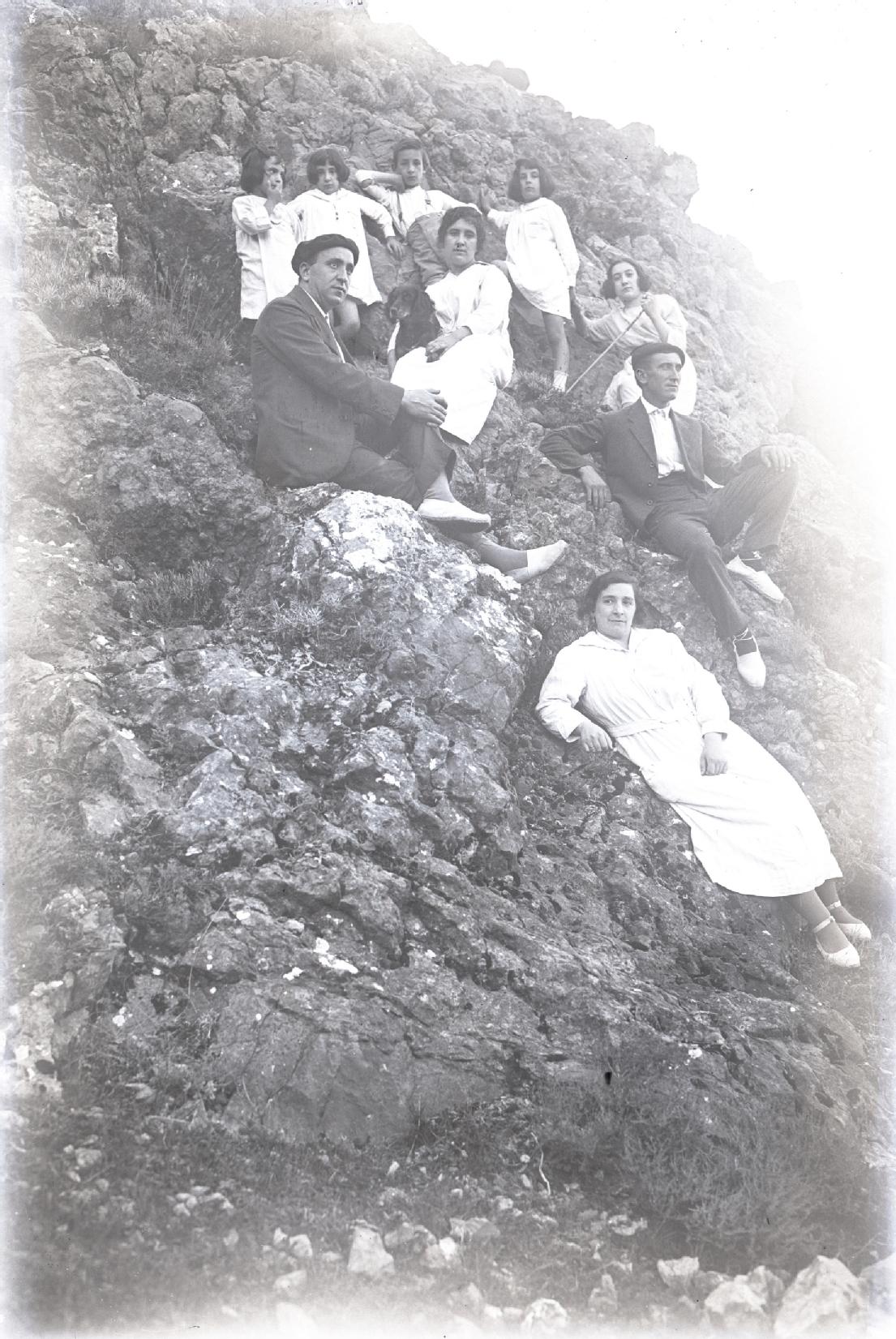 Retrato de José Martínez Berasáin y Ramona Erro con su familia en unas rocas. José Martínez Berasáin el primero de la izquierda, debajo Ramona Erro, detrás 2 chicas y un chico y al fondo 3 niñas y un niño.