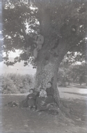 Retrato de la familia Martínez Erro en un árbol. En la base del árbol sentadas Ramona Erro y sus hijas Margarita y Mercedes; subidos en una rama, José Martínez Berasáin con su hijo Luis.