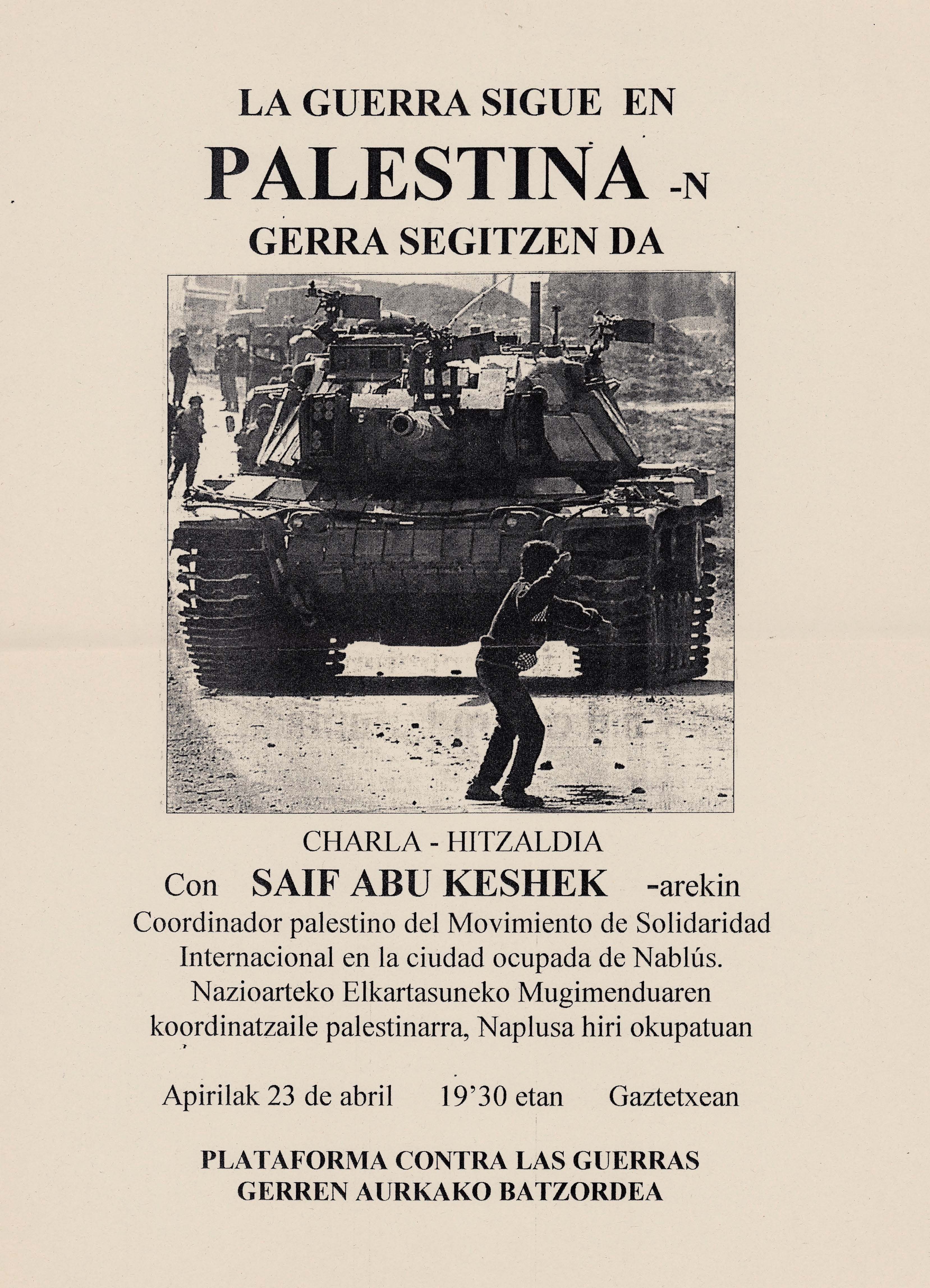 Cartel que anuncia una charla sobre la guerra en Palestina, organizada por la Plataforma contra las guerras. La charla es el 23 de abril en el Gaztetxe (posiblemente Euskal Jai) y corre a cargo de Saif Abu Keshek, coordinador palestino del Movimiento de Solidaridad Internacional en la ciudad ocupada de Nablús. El cartel está ilustrado con una fotografía de un niño palestino frente a un tanque.