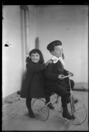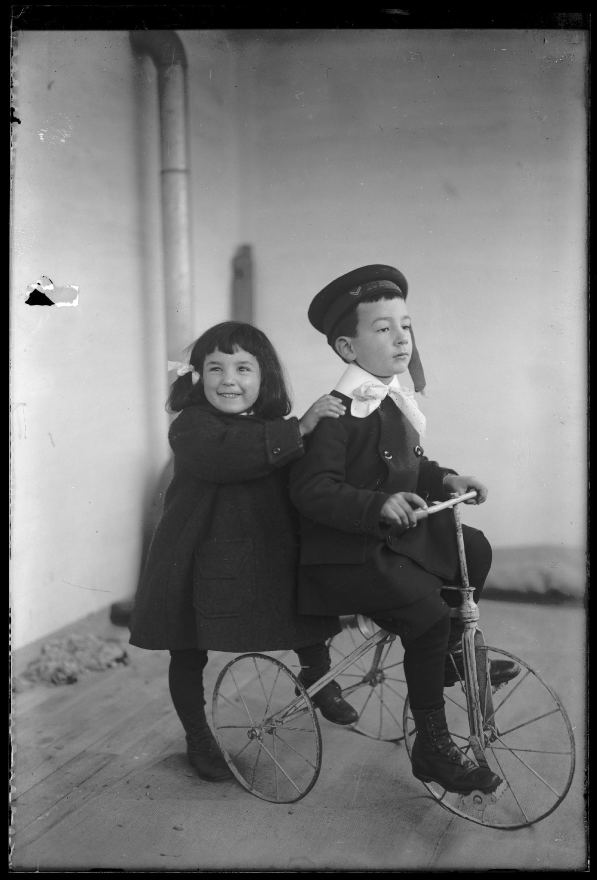 Retrato en plano entero de Luis y Margarita, hijos de José Martínez Berasáin y Ramona Erro Cía, con un triciclo. Luis, sentado y Margarita apoyada en la parte trasera.