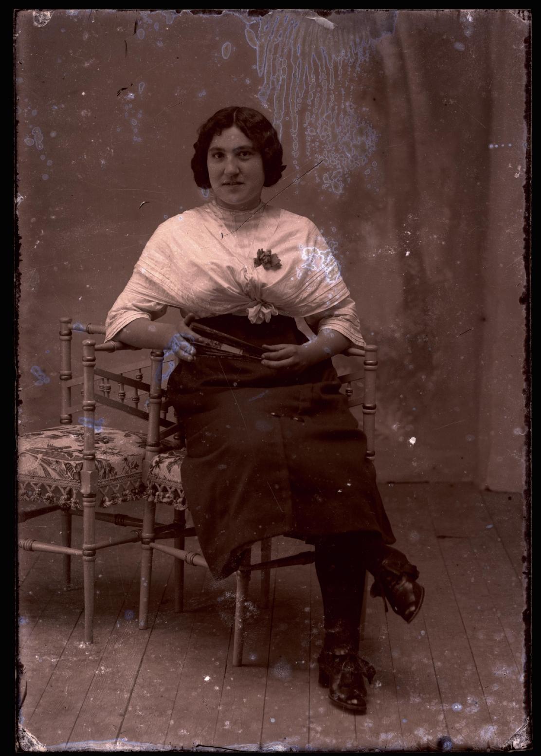 • Contenido: Retrato en plano entero de una mujer joven sentada en una silla con un abanico en las manos.