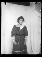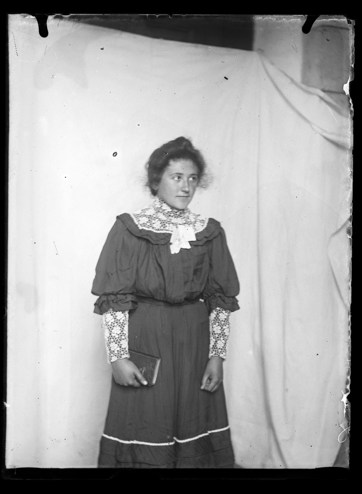 • Contenido: Retrato en plano americano de una mujer joven con un libro en la mano ante un fondo de tela.