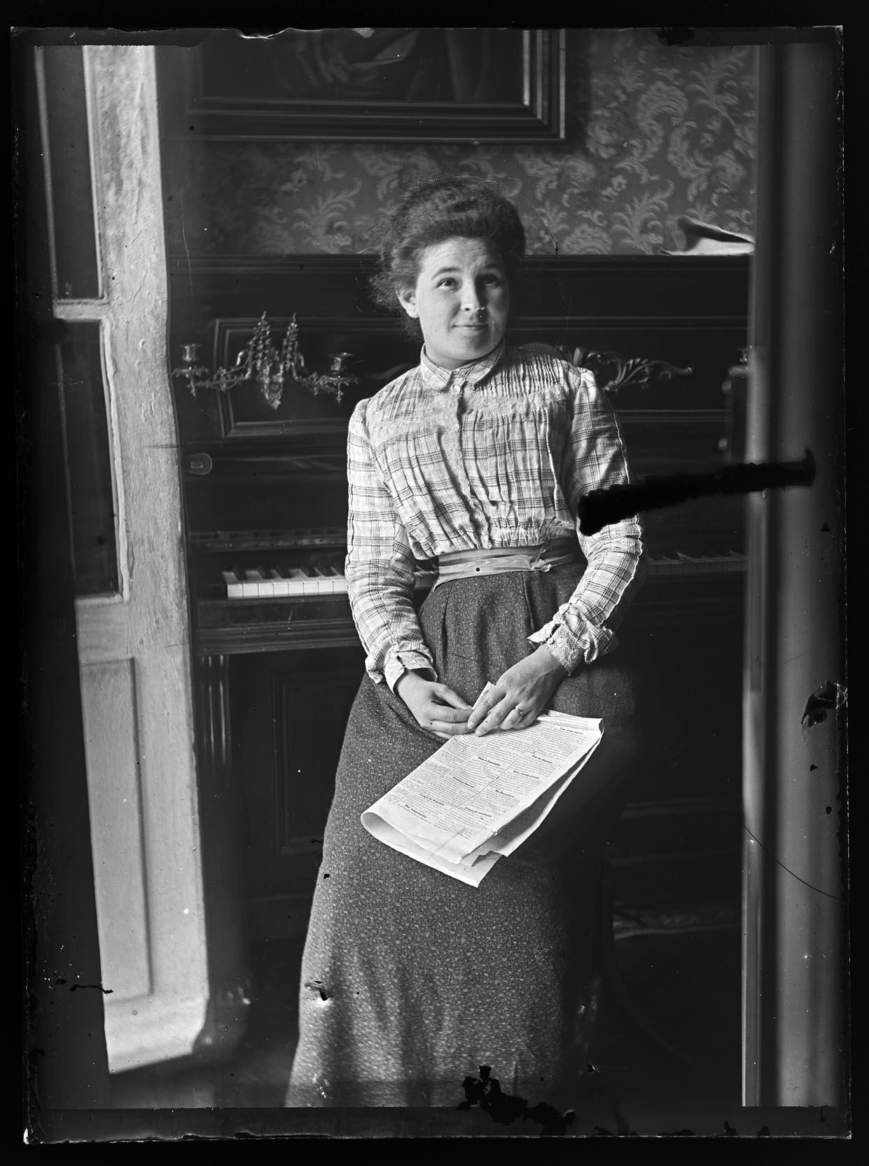 Retrato en plano entero de una mujer joven del entorno de la familia Iraizoz Astiz, sentada junto a un piano y con un periódico en las manos.