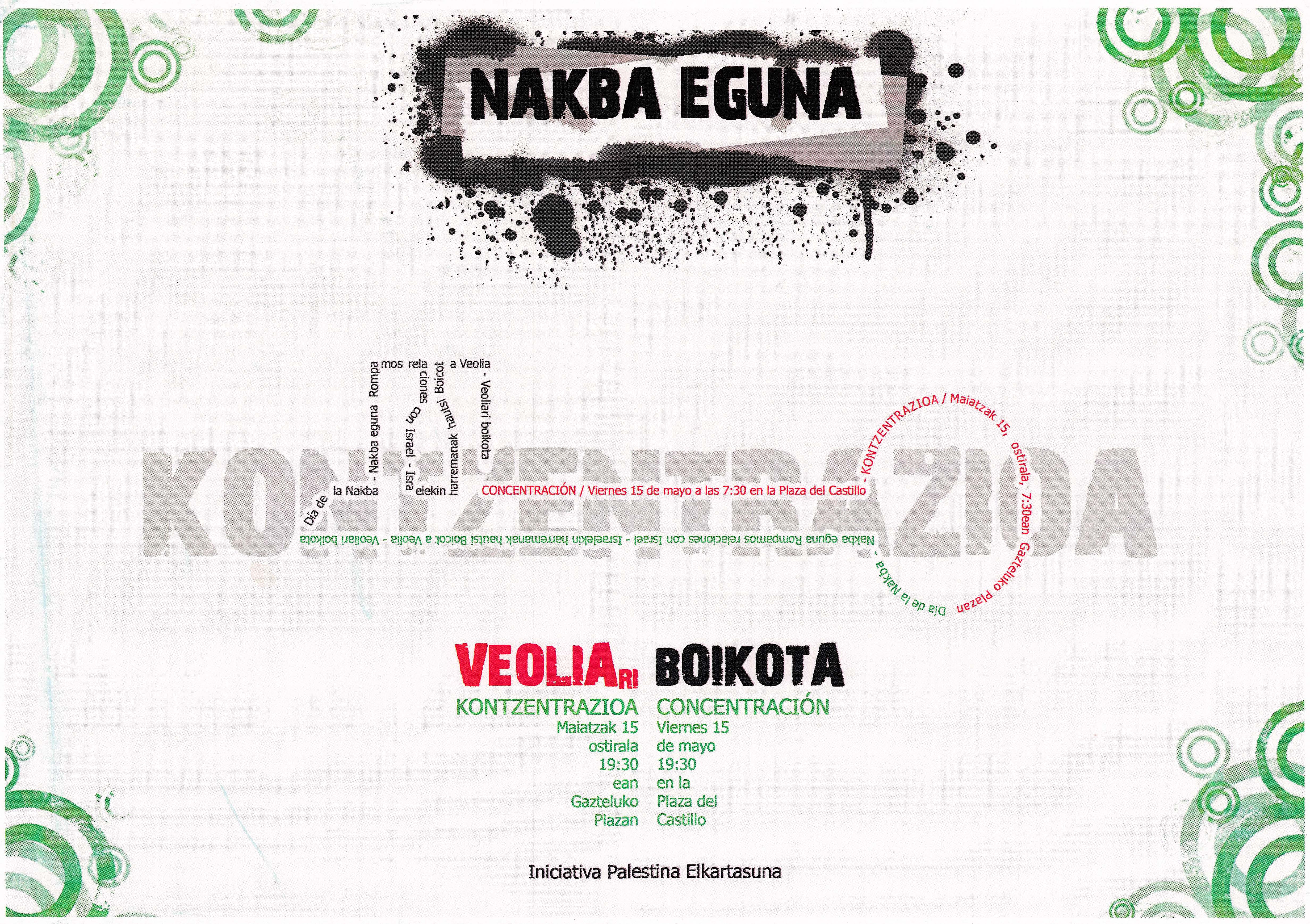 Cartel que anuncia una concentración en la Plaza del Castillo de Pamplona el 15 de mayo, con motivo del día Nakba y la solidaridad con el pueblo palestino. La movilización está convocada por la Inicativa Palestina Elkartasuna, y se centra en boicotear a la empresa Veolia, como parte de la campaña Boicot, Desinversión y Sanciones (BDS).