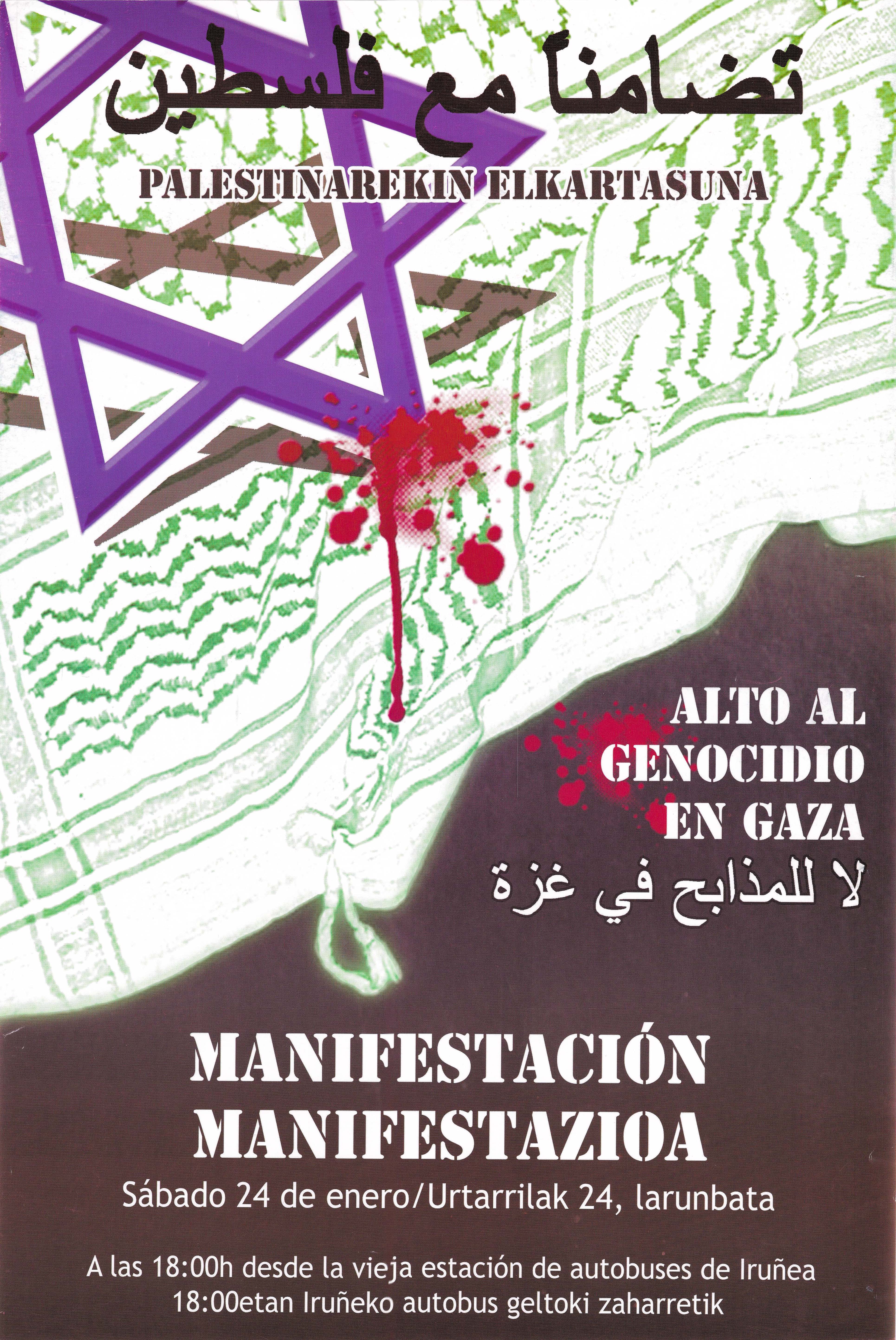 Cartel anunciador de una manifestación de solidaridad con Palestina el 24 de enero, a las 18:00 horas, desde la antigua estación de autobuses de Pamplona. El cartel está en euskera, castellano y árabe y muestra una estrella de David contra un pañuelo palestino, generando sangre. El cartel no va firmado y puede pertenecer a diversos periodos, ya que Israel ha bombardeado Gaza en repetidas ocasiones. En cualquier caso, la denominada Operación Plomo Fundido, una de las más sangrientas, se desarrolló entre el 17 de diciembre de 2008 hasta el 18 de enero de 2009, y el cartel podría hacer referencia a ese bombardeo.