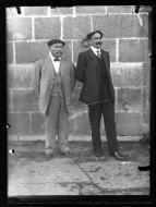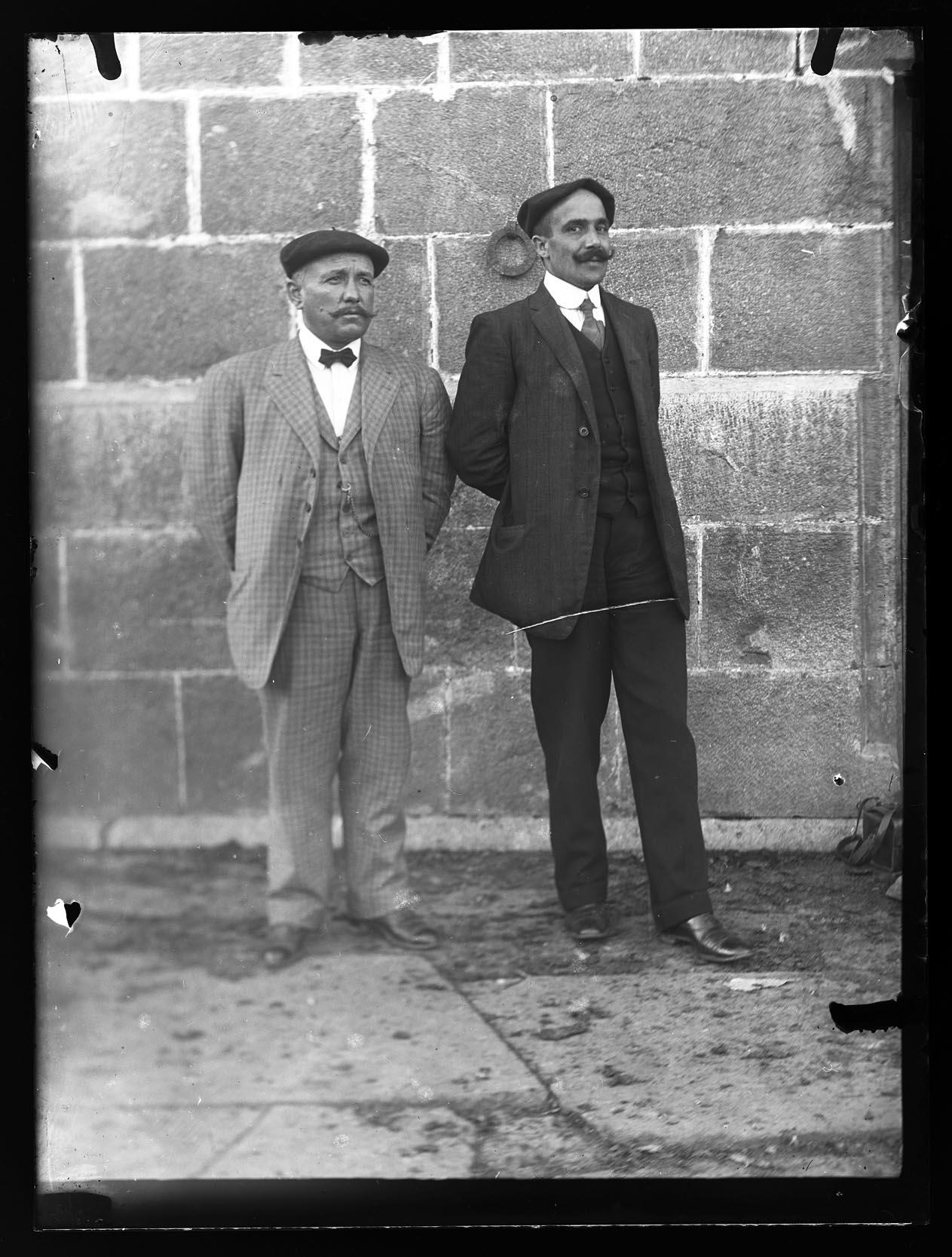 • Contenido: Retrato en plano entero de 2 hombres con bigote, vestidos con traje y cubiertos con boina en el exterior de un edificio.