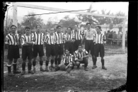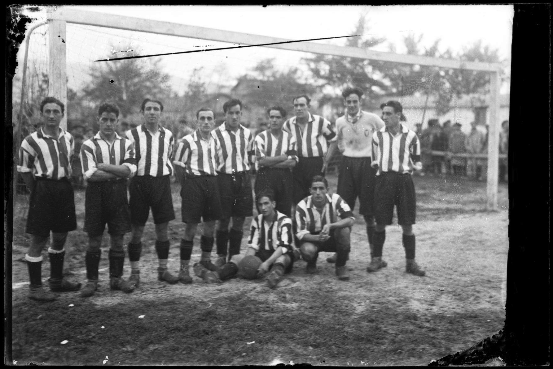 Retrato colectivo de la alineación titular del equipo visitante en un partido de fútbol celebrado en el antiguo campo del Club Atlético Osasuna en el barrio de San Juan en Pamplona, tomado ante la portería.