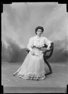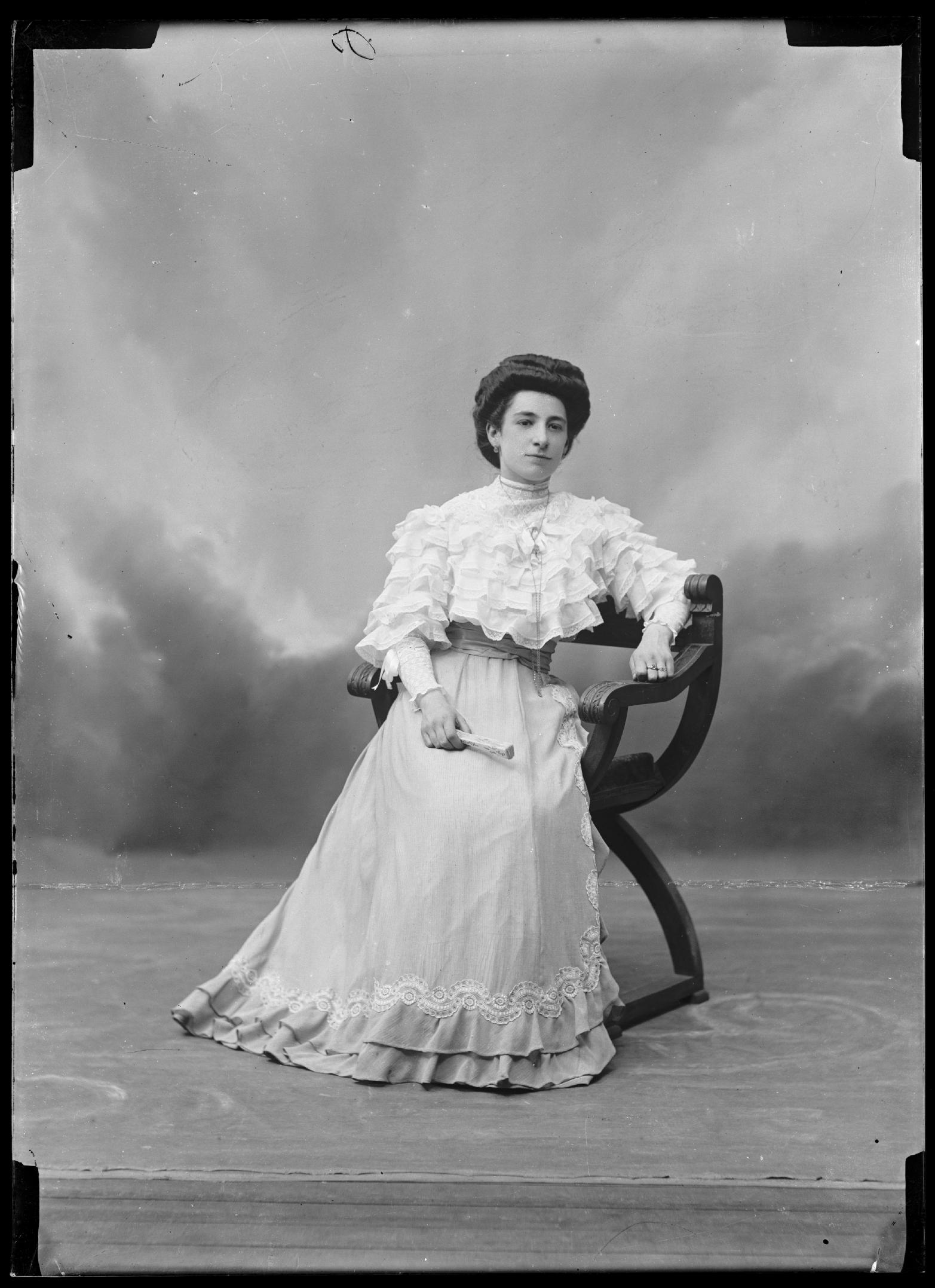 Retrato de estudio en plano entero de Ramona Erro, mujer de José Martínez Berasáin, sentada en una silla con brazos y con un abanico en la mano. De fondo, un telón decorativo con nubes.