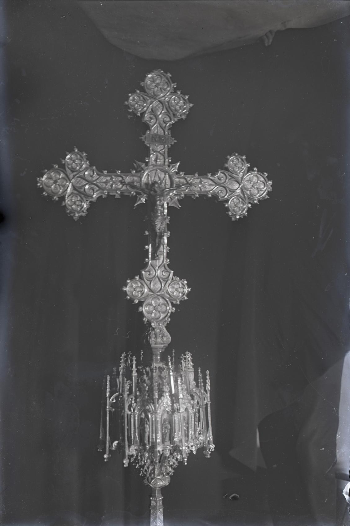 • Contenido: Vista parcial de la cruz procesional del santuario de San Miguel de Aralar. Anverso de la cruz de estilo neogótico.