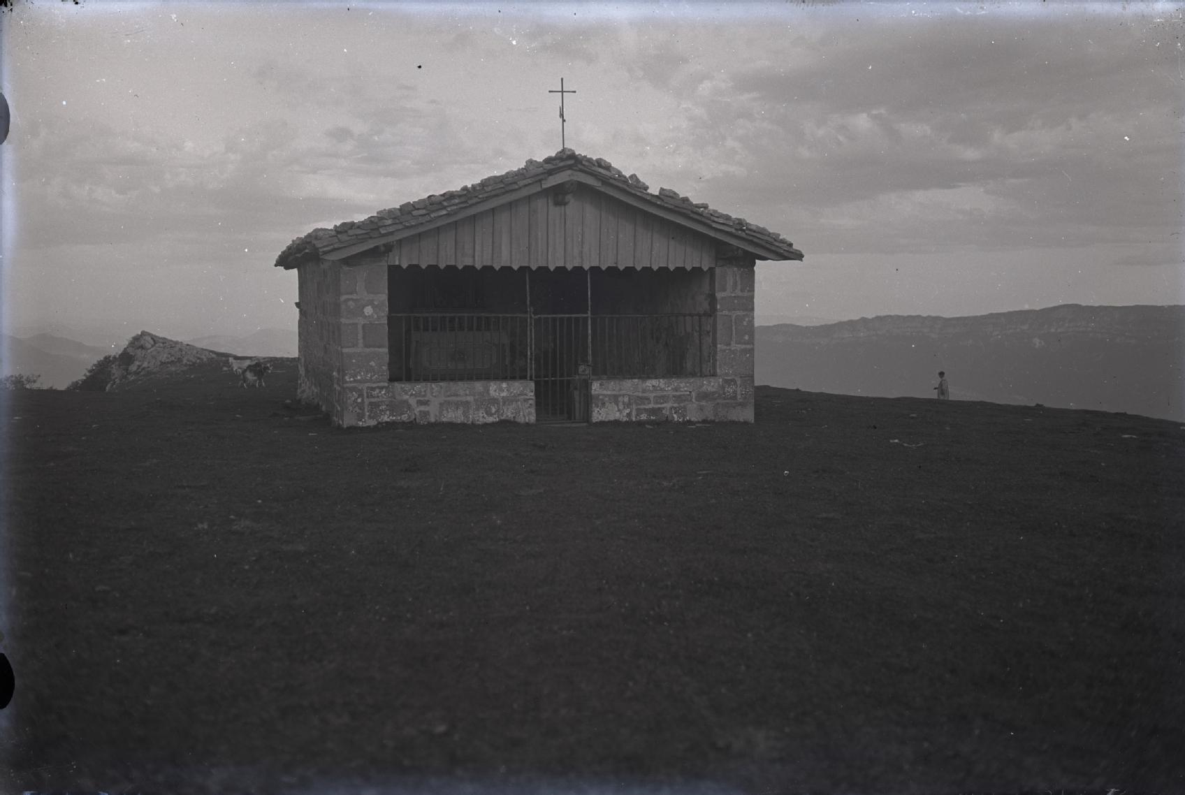 Vista general de la ermita de la Trinidad de Huarte-Araquil en la sierra de Aralar junto a los ábsides del santuario. Imagen tomada desde el noroeste. En primer término la fachada de la ermita-humilladero, en segundo plano, a la izquierda, una vaca y, a la derecha, un hombre. Al fondo la sierra de Satrústegui.