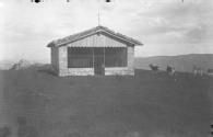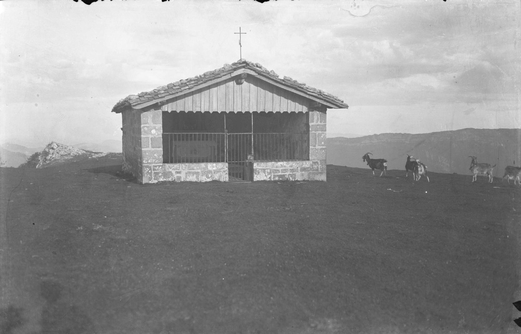 Vista general de la ermita de la Trinidad de Huarte-Araquil en la sierra de Aralar junto a los ábsides del santuario. Imagen tomada desde el noroeste. En primer término la fachada de la ermita-humilladero, en segundo plano, en la derecha, 5 cabras. Al fondo la sierra de Satrústegui.