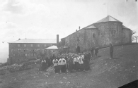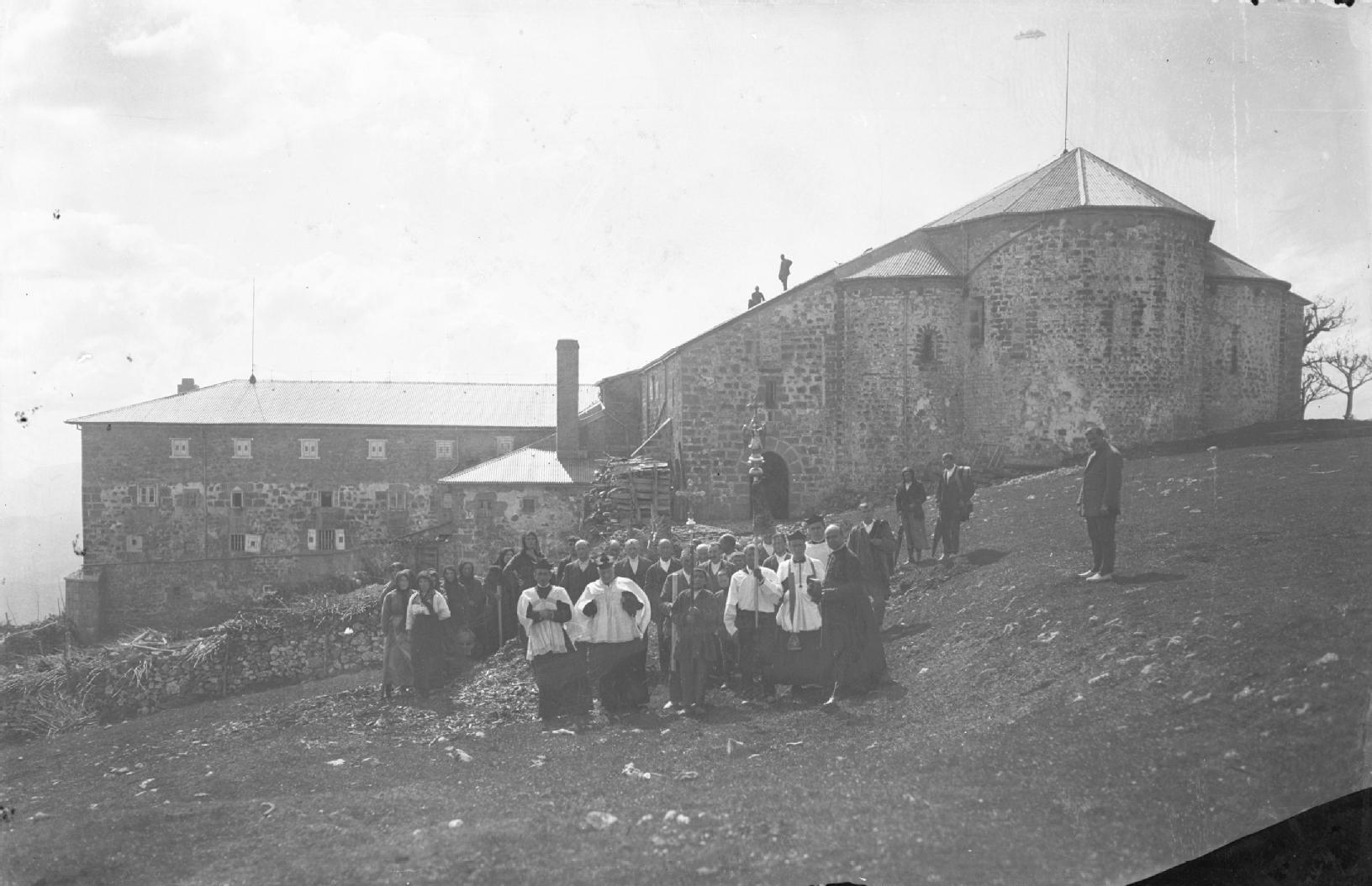 Vista general de una procesión con el Ángel de Aralar saliendo del santuario tomada desde el este. En primer término una cruz procesional custodiada por un sacerdote y un acólito, seguida de la imagen del Ángel y un grupo de hombres y mujeres. Detrás el santuario en la derecha y la hospedería en la izquierda.