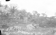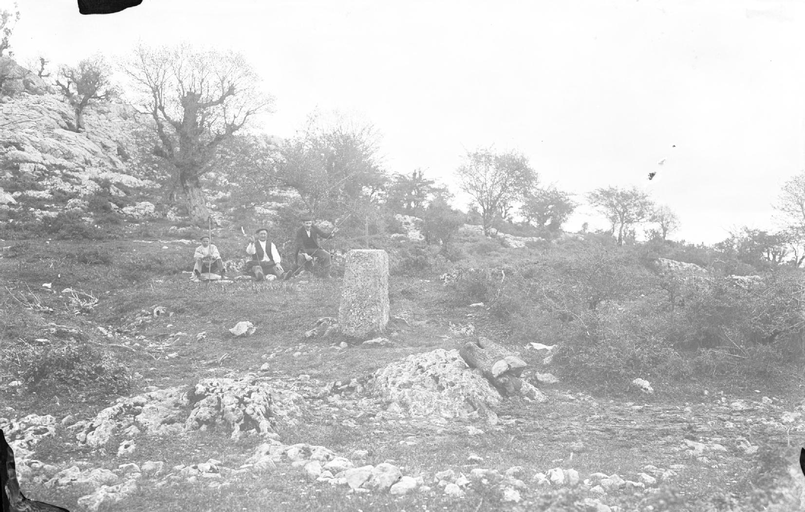 Retrato en plano entero de 2 hombres y un niño en la sierra de Aralar. En primer término un mojón con una sencilla cruz de hierro, en segundo plano un niño y 2 hombres sentados en el suelo. Al fondo el paisaje rocoso y árboles de la sierra.