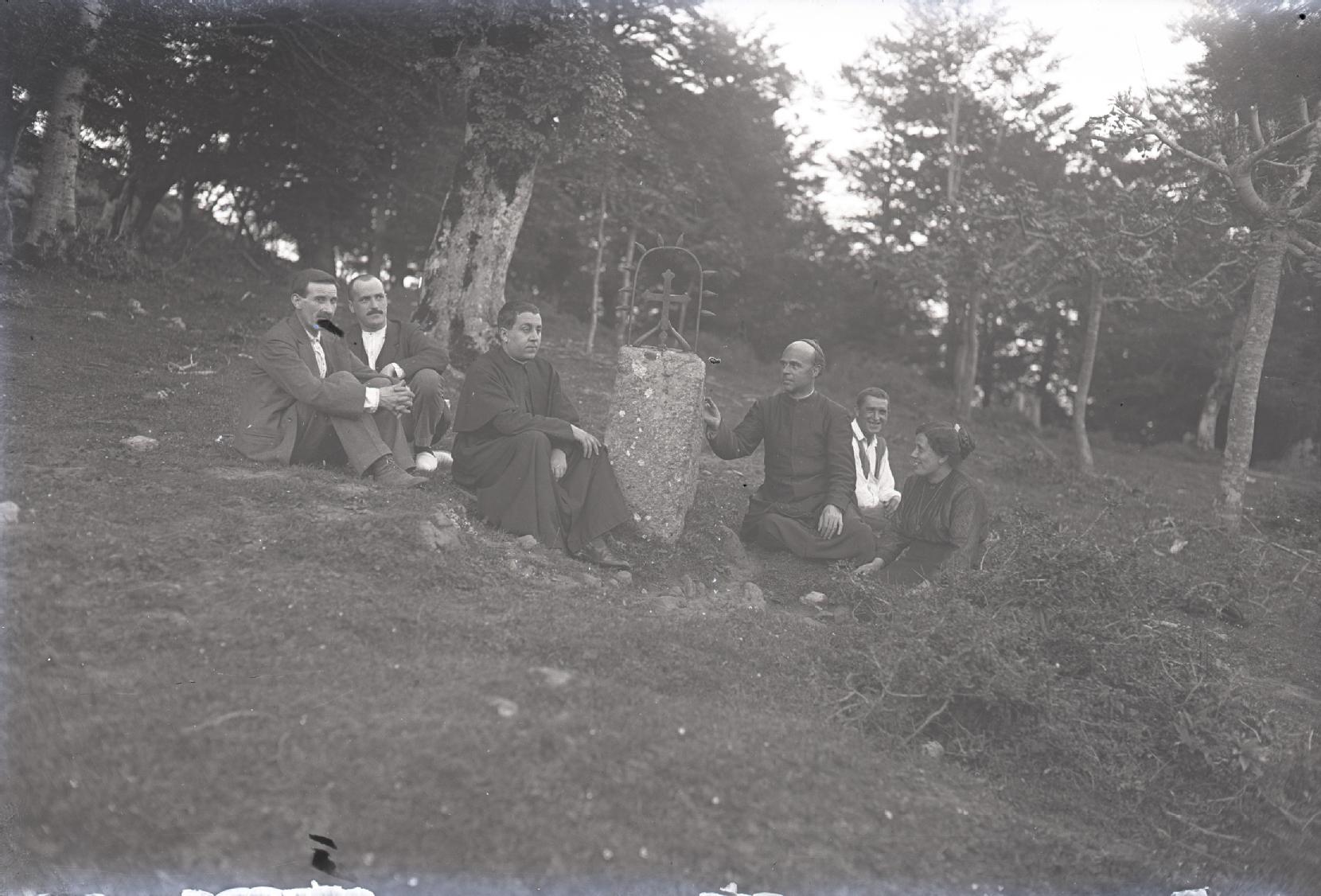 Retrato en plano entero de 5 hombres y una mujer en la sierra de Aralar. En primer término el grupo formado por 5 hombres, 2 de ellos sacerdotes, y una mujer sentados en torno a un mojón con una cruz de hierro. Al fondo árboles de la sierra.