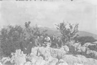 Retrato en plano entero de un grupo de personas sentados sobre unas rocas en la sierra de Aralar. En primer término 7 hombres, uno de ellos cura, y una mujer sentados, detrás unos árboles y al fondo los montes del entorno.