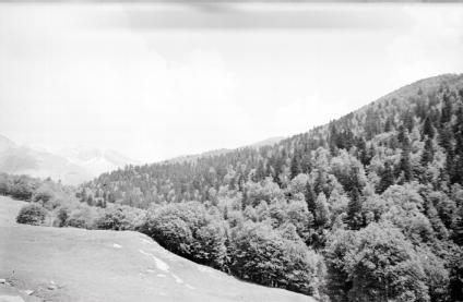 Vista parcial del valle de Zuriza, alto valle de Ansó, provincia de Huesca. n el centro, el barranco de Gamueta y, en la derecha, un bosque de abetos.