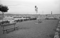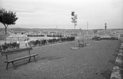 Vista del sector oriental del paseo del Príncipe de Viana en la localidad de Viana, Navarra. En primer término, los bancos y, al fondo, el crucero.