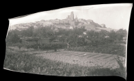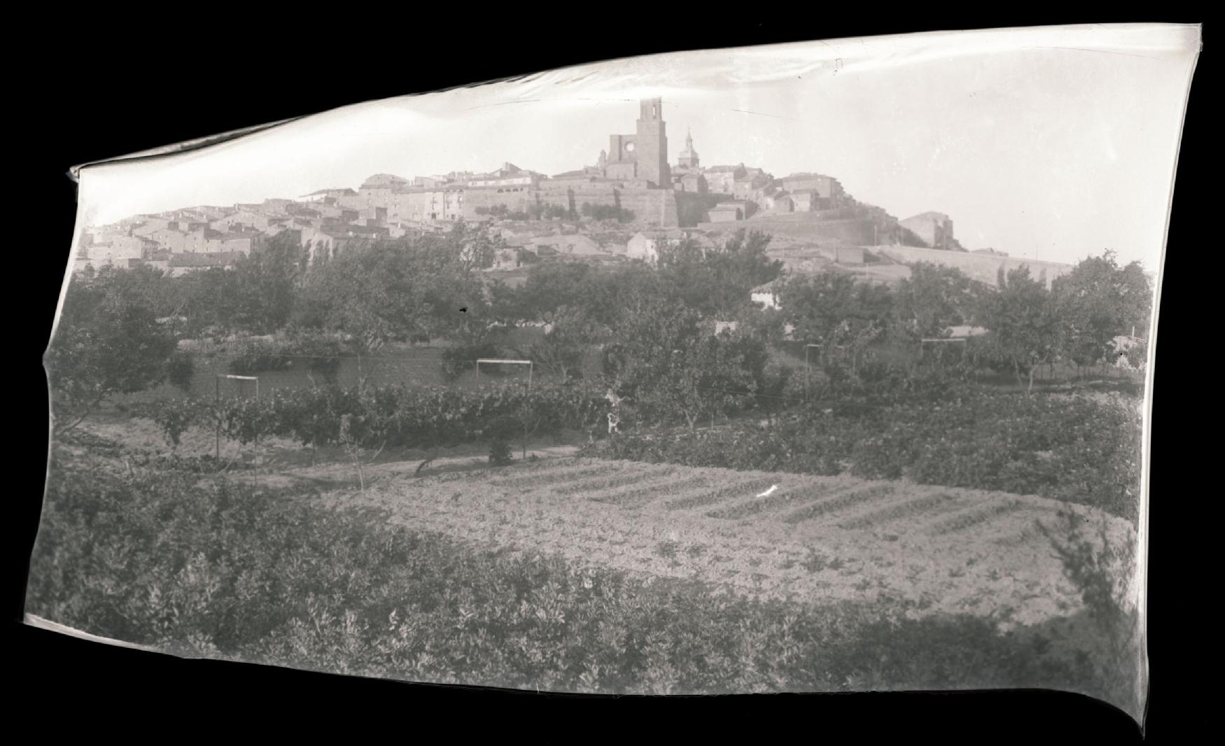 Vista de la localidad de Viana tomada desde el suroeste. En primer término las huertas del Arenal, en segundo plano las murallas del lado oeste del recinto amurallado y la iglesia de San Pedro con la torre en pie. Al fondo las casas del casco urbano y la torre de Santa María.